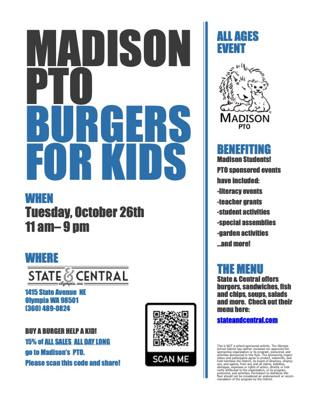 Coming up on Tuesday, October 26th, State & Central restaurant is hosting a fundraiser for the Madison PTO! They’ll donate 15% of sales ALL DAY LONG to the Madison PTO! here are the details!